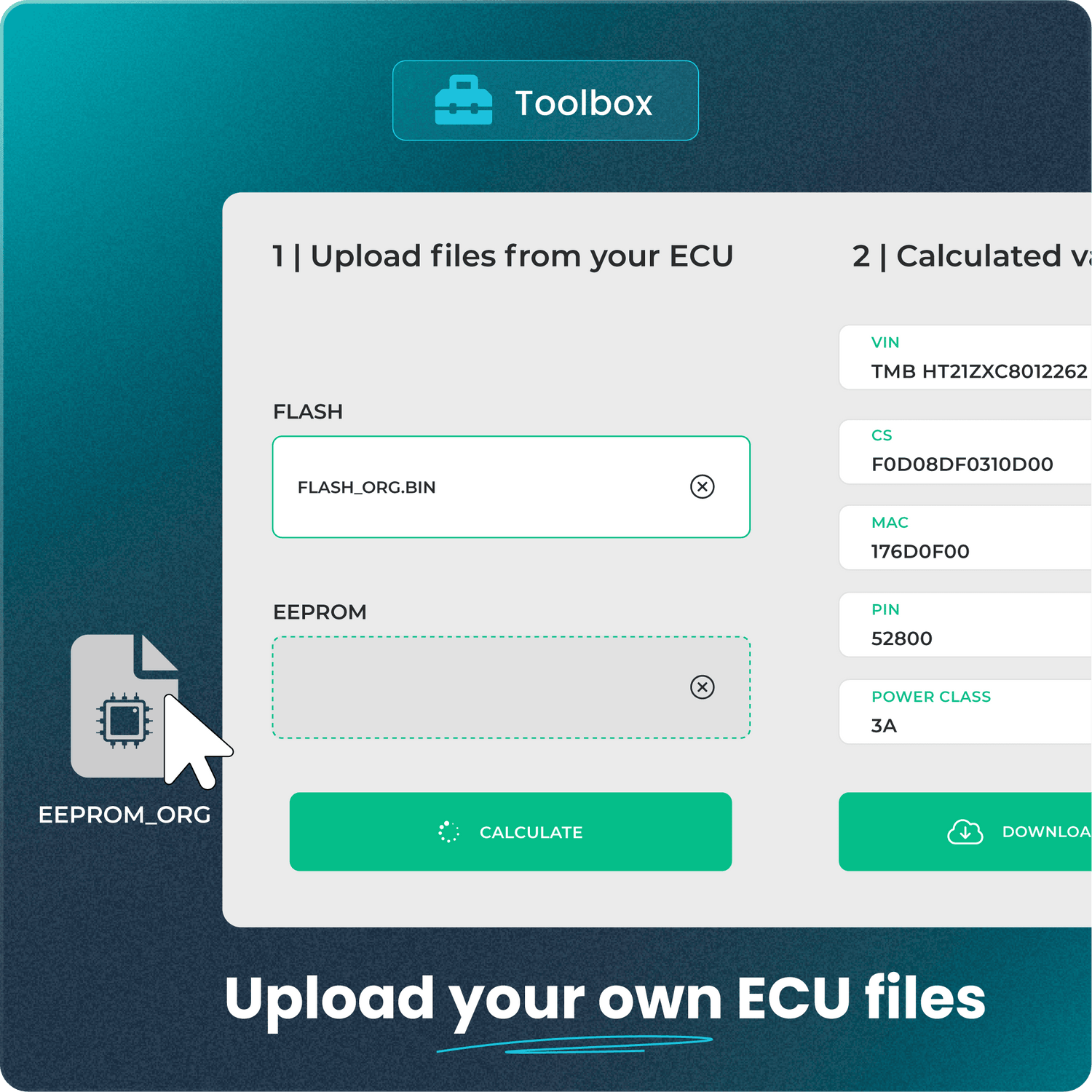 Laad uw eigen originele ECU-bestanden en lees direct belangrijke waarden uit, zoals VIN, CS, MAC, PIN, Power Class, enz.