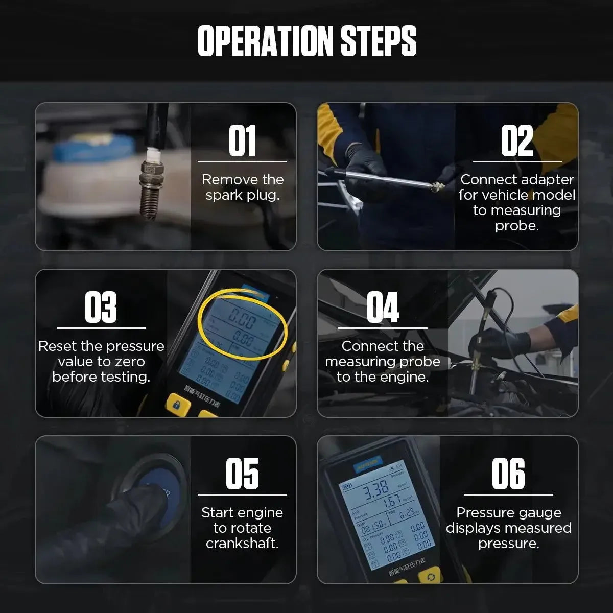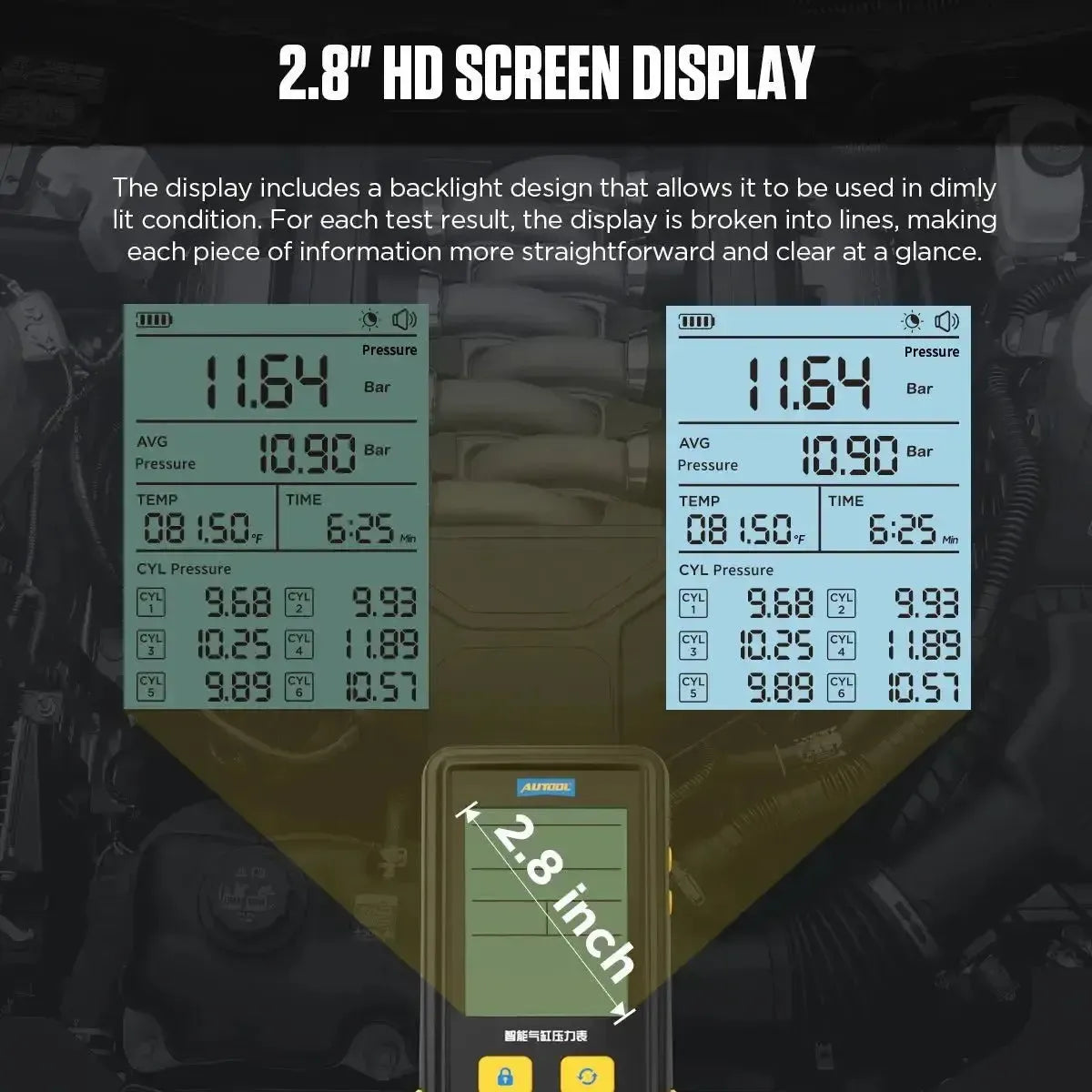 • Digitale meting: Toont real-time druk, gemiddelde druk en de individuele drukwaarden per cilinder met een resolutie tot twee decimalen.