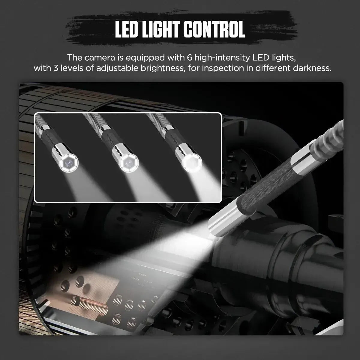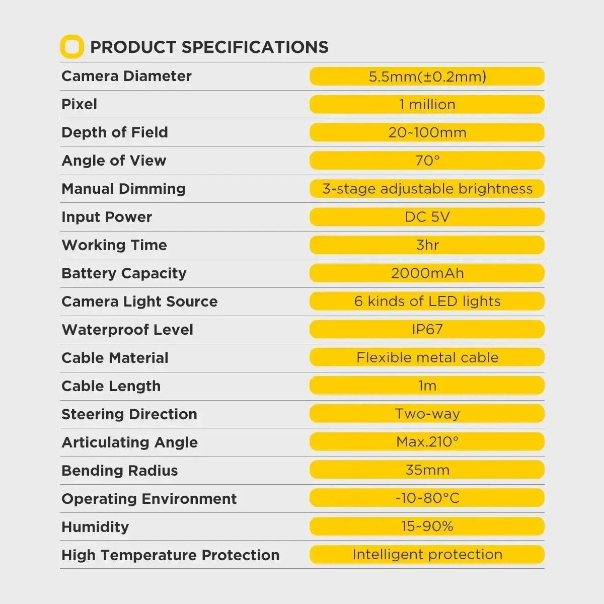 - Instelbare ledverlichting: De lichtintensiteit van de 6 leds kan in 3 stappen worden aangepast om over- of onderbelichting in verschillende inspectieomgevingen te voorkomen.