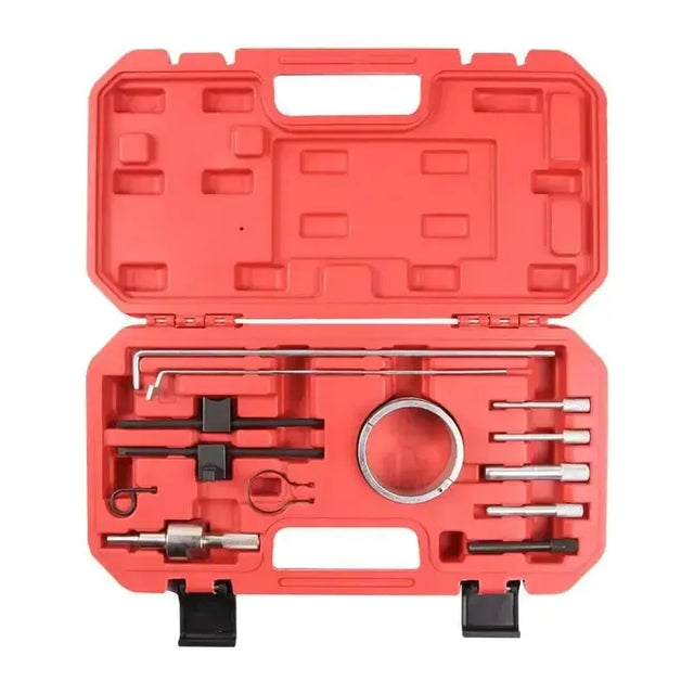 Deze set bevat alle benodigde gereedschappen, zoals vergrendelpennen voor de nokkenassen, een vliegwielvergrendelgereedschap en diverse spannergereedschappen. Het gebruik van deze instrumenten waarborgt de correcte timing van de motor na vervanging van de distributieriem, wat essentieel is voor de motorprestaties en het voorkomen van motorschade.