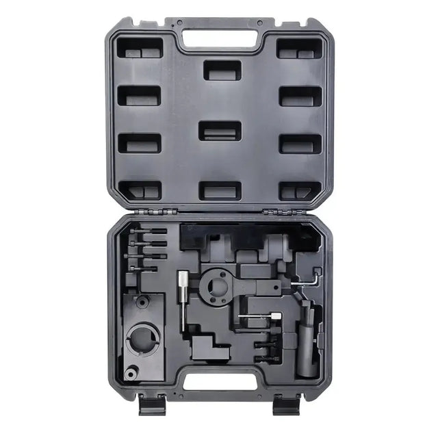 De inhoud van de set omvat gereedschappen voor het fixeren van de krukas, nokkenassen, het tandwiel van de hogedrukpomp en de kettingspanner. Het gebruik van deze instrumenten zorgt voor het behoud van de correcte motortiming tijdens onderhoud of vervanging van de distributieketting, wat essentieel is voor de motorprestaties.